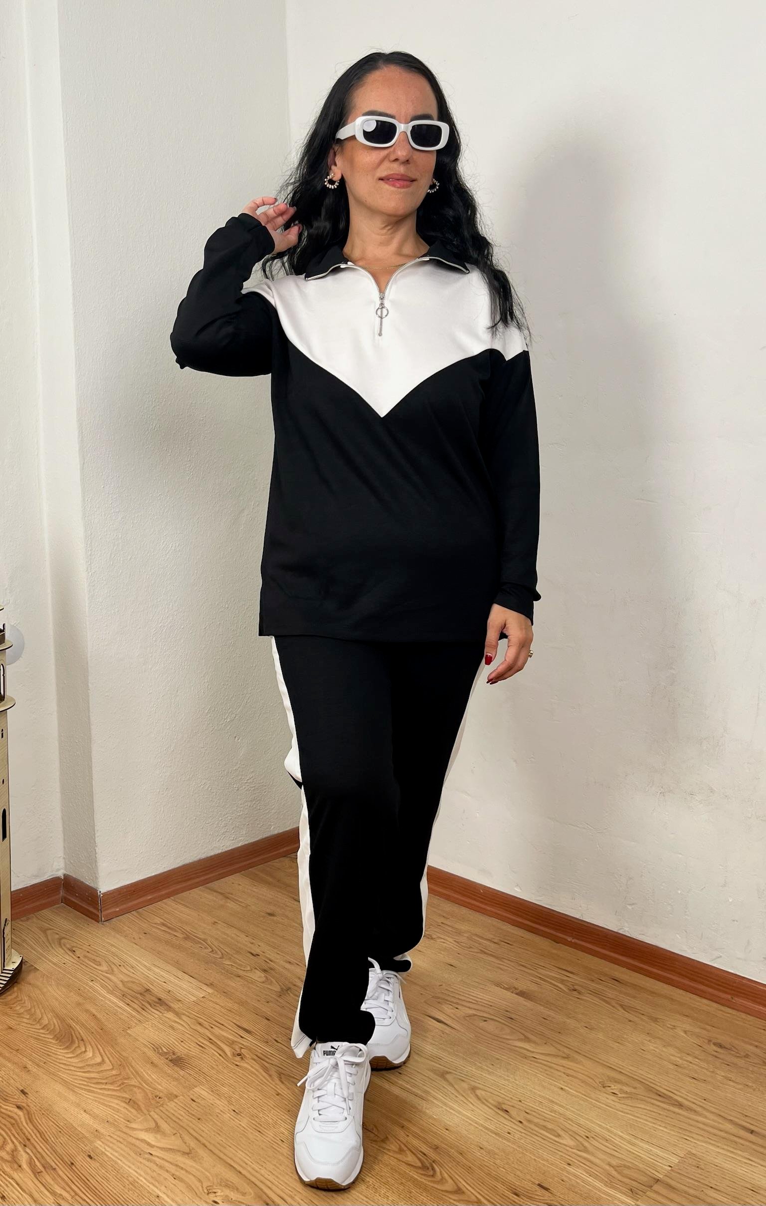 FERMUARLI YAKA BEYAZ ŞERİT DETAYLI SİYAH UZUN KOLLU TAKIM