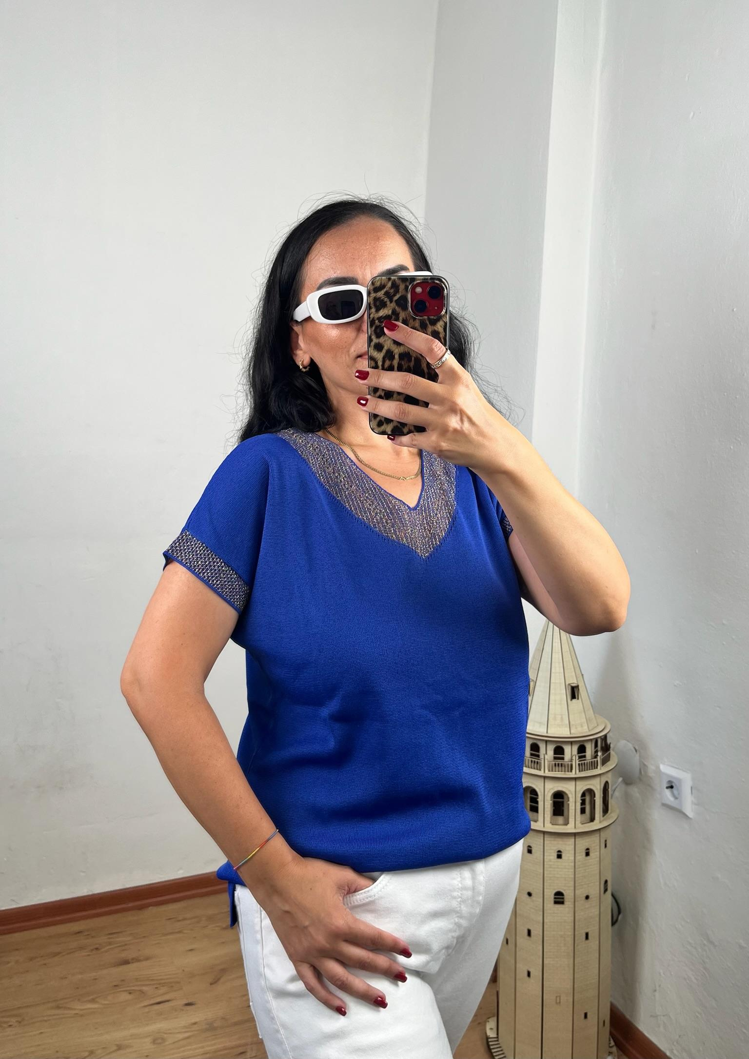 SİM DETAYLI V YAKA KISA KOLLU MAVİ TRİKO BLUZ