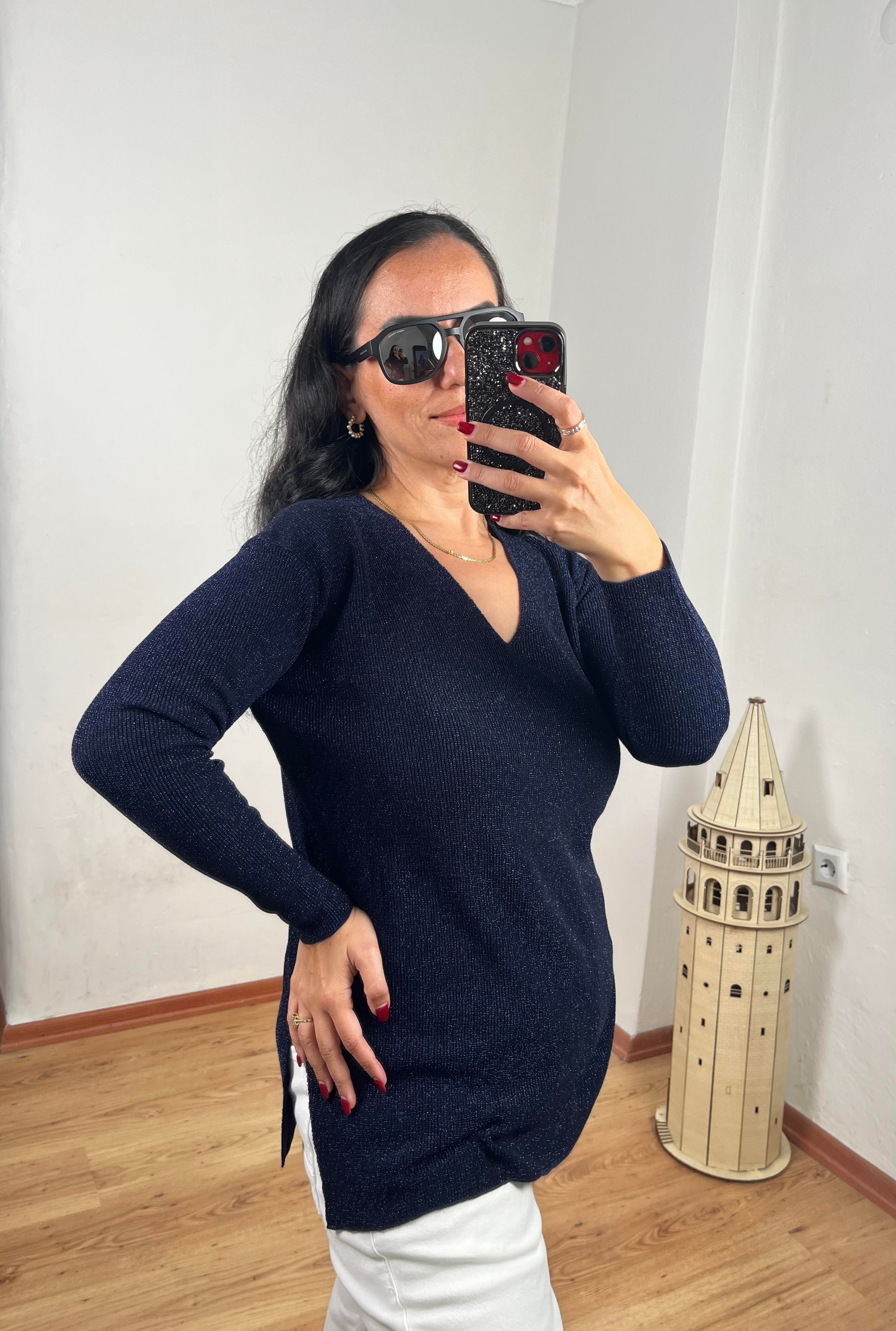 SİMLİ V YAKA LACİVERT TRİKO BLUZ