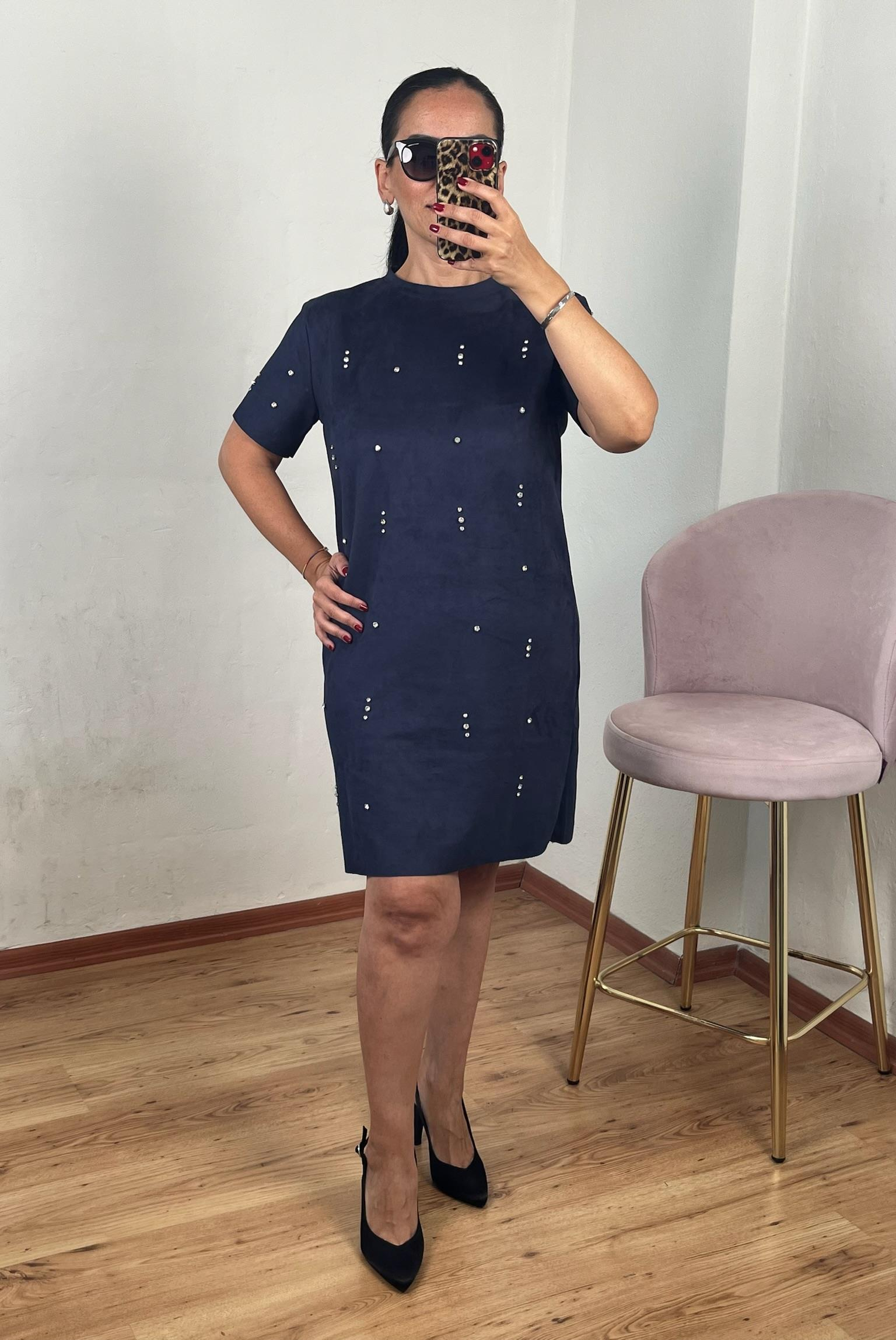 SÜET PARLAK TAŞLI LACİVERT ELBİSE